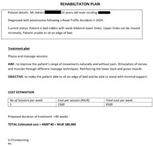 Adrien, 31 ans, souffre d’un polytraumatisme grave. Financièrement, son traitement coûtera Rs 180,000 .